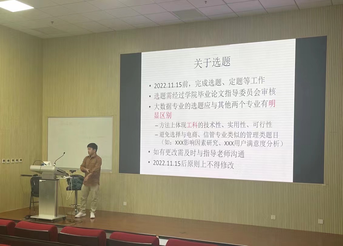 2022年10月20日,信息学院在求索楼302召开2023届本科生毕业论文(设计)写作布置及指导专题会,电子商务系屈启兴老师、信息管理与信息系统系顾睿老师、大数据系汪波老师、本科教学办公室丁东老师,以及2023届全体本科生参加会议。