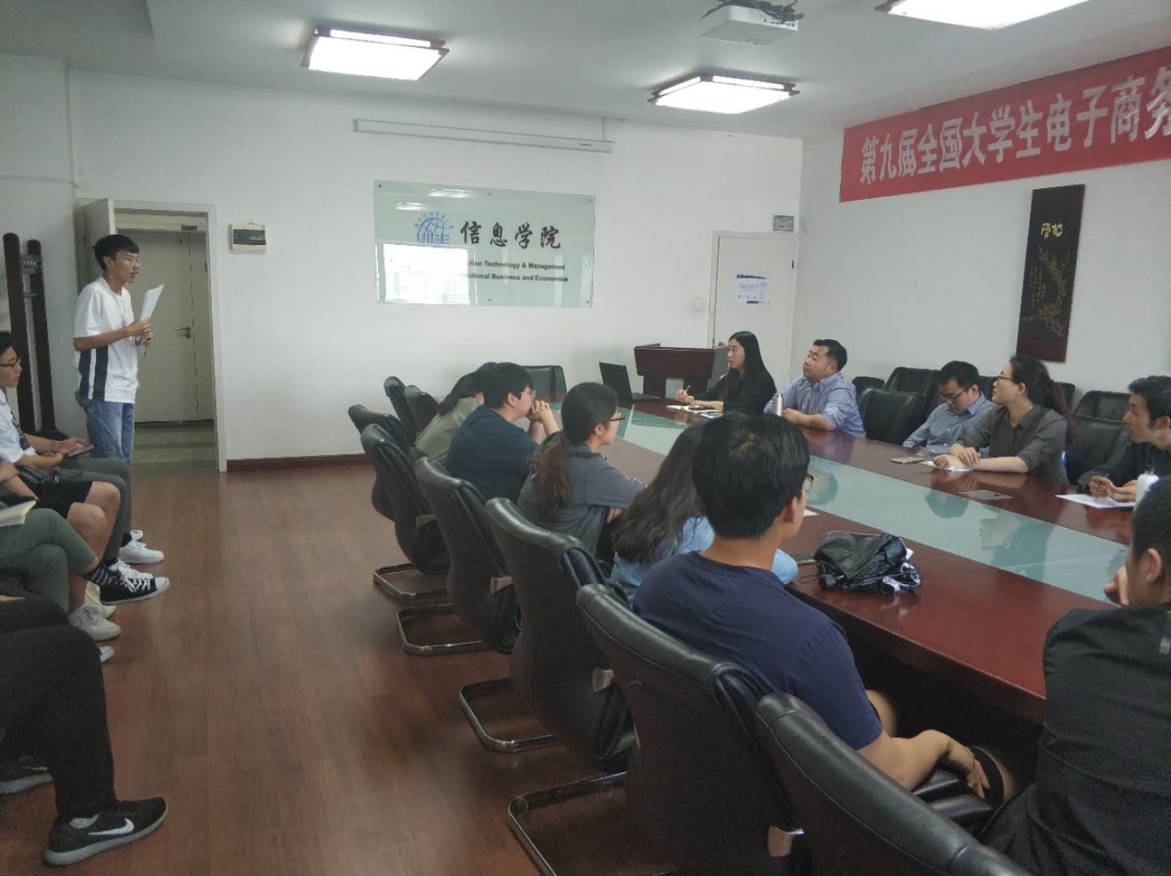 5月9日信息学院2018-2019学年第二学期学生座谈会在博学楼1416会议室召开。会议由本科教学副院长倪耀东主持,电商系主任程絮森老师、信管系主任于晓丹老师、大数据系主任黄浩老师、教学秘书郭程老师以及22名学生代表参加了此次座谈会。