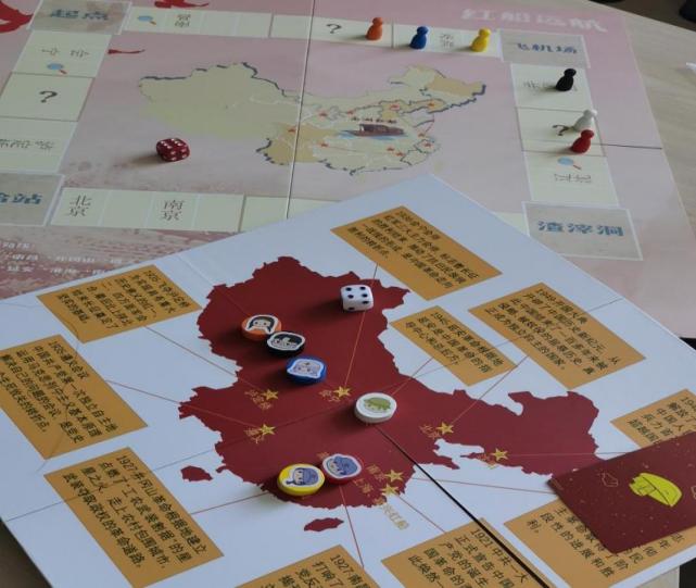 随后组织大家开展红色桌游的体验,参与者们每6个人围成一个小组,配合我党的发展路线图和棋子闭合式前进路线图两张地图使用,按照规则的指引,抽取卡牌,投掷骰子,严格按照嘉兴红船一南昌一井冈山一遵义一泸定桥一会宁一延安一辽沈一南京一北京的顺序打卡,行进的过程中还会触发问题卡和事件卡,知识问答卡的设计将党史知识融入游戏环节,以玩家相互提问的方式进行,将党史知识学习趣味化的同时也将记忆深刻化。