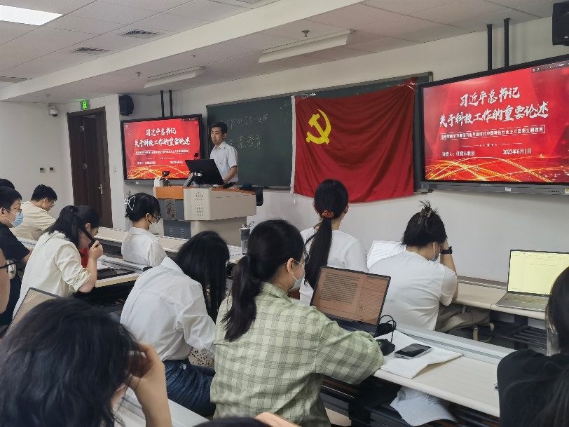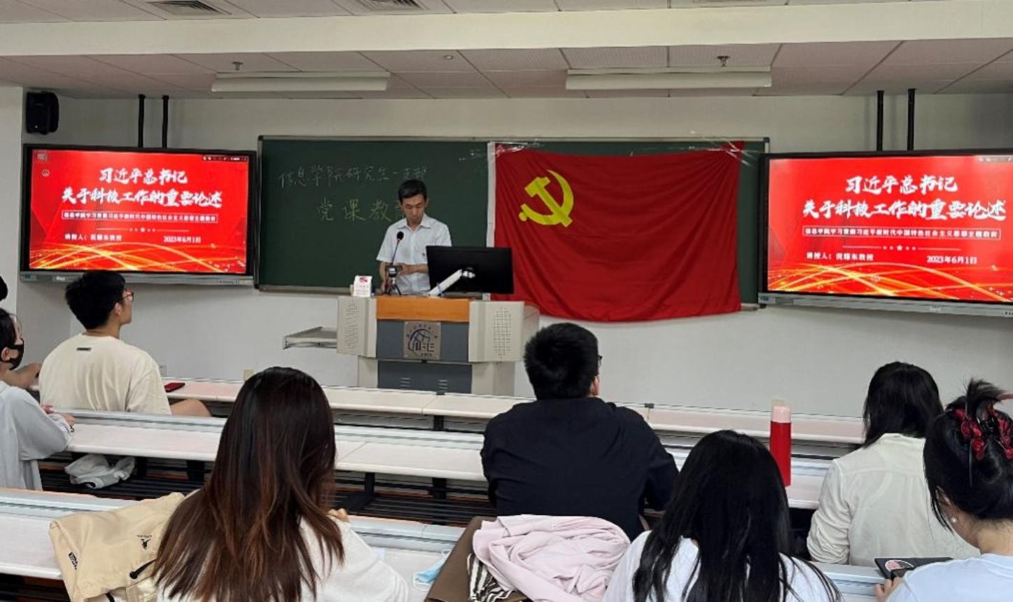 为扎实推动学习贯彻习近平新时代中国特色社会主义思想主题教育走深走实,贯彻落实“学思想、强党性、重实践、建新功”的总要求,6月1日16:00,信息学院副院长倪耀东讲授专题党课《习近平总书记关于科技工作的重要论述》,信息学院研究生一支部全体党员和积极分子参与学习。