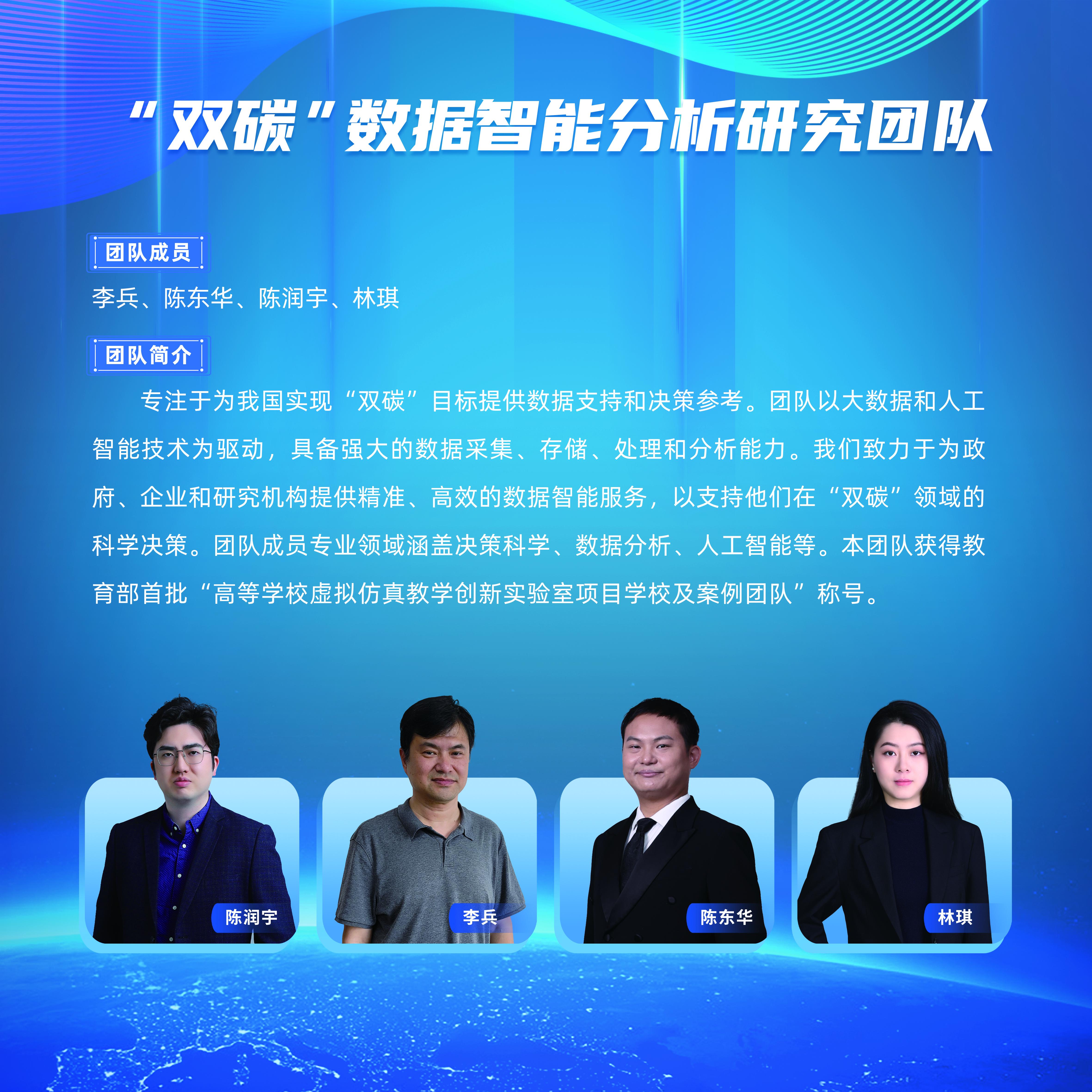 专注于为我国实现“双碳”目标提供数据支持和决策参考。团队以大数据和人工智能技术为驱动,具备强大的数据采集、存储、处理和分析能力。我们致力于为政府、企业和研究机构提供精准、高效的数据智能服务,以支持他们在“双碳”领域的科学决策。团队成员专业领域涵盖决策科学、数据分析、人工智能等。本团队获得教育部首批“高等学校虚拟仿真教学创新实验室项目学校及案例团队”称号。