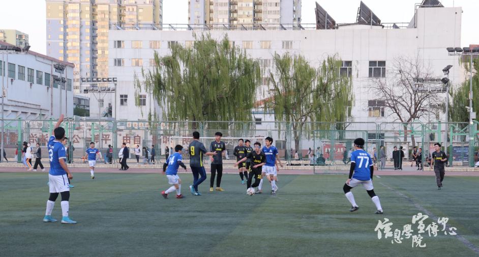 2021年4月16日,下午6:30。春风习习,天气微凉。比赛前男足队员们进行了充分的热身准备,跃跃欲试。他们身着短衣短裤互相鼓励,商量战术,用对足球的热爱和昂扬的斗志给自己升温。信息学院对抗商学院的比赛一触即发。