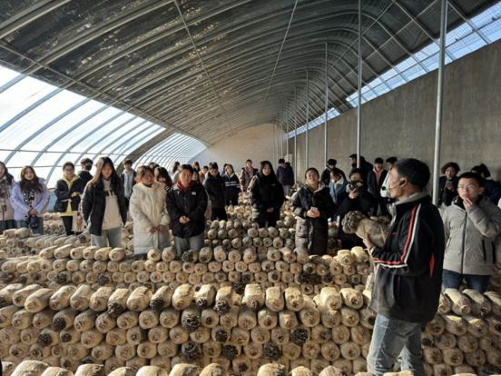 到达北京鸿泽嘉园种植专业合作社后,首先参观食用菌的科研基地,具有丰富经验的食用菌技术人员现场讲解,帮助学生了解食用菌的菌种、生长过程、采摘技巧、如何确保食用菌生长环境、温度和湿度等相关细节问题。通过生动的讲解和图片展示,学生们对食用菌有了初步的认识。随后,在技术人员的指导下,学生们动手采摘食用菌,工作人员强调在采摘过程中避免损伤菌盖、保持菌体完整等。学生们体验采摘食用菌的乐趣,并仔细观察食用菌的生长状态,加深对食用菌生长过程的理解。互动交流环节,学生们围坐在一起,进行热烈的交流与分享。技术人员耐心解答学生们的疑问,并鼓励他们将所学知识应用到实际生活中,比如帮助农户开发销售小程序等,为农户打造便捷高效的线上销售平台,帮助拓宽销售渠道,增强市场竞争力,让优质农产品直达消费者,实现农民增收与乡村振兴的双赢局面。