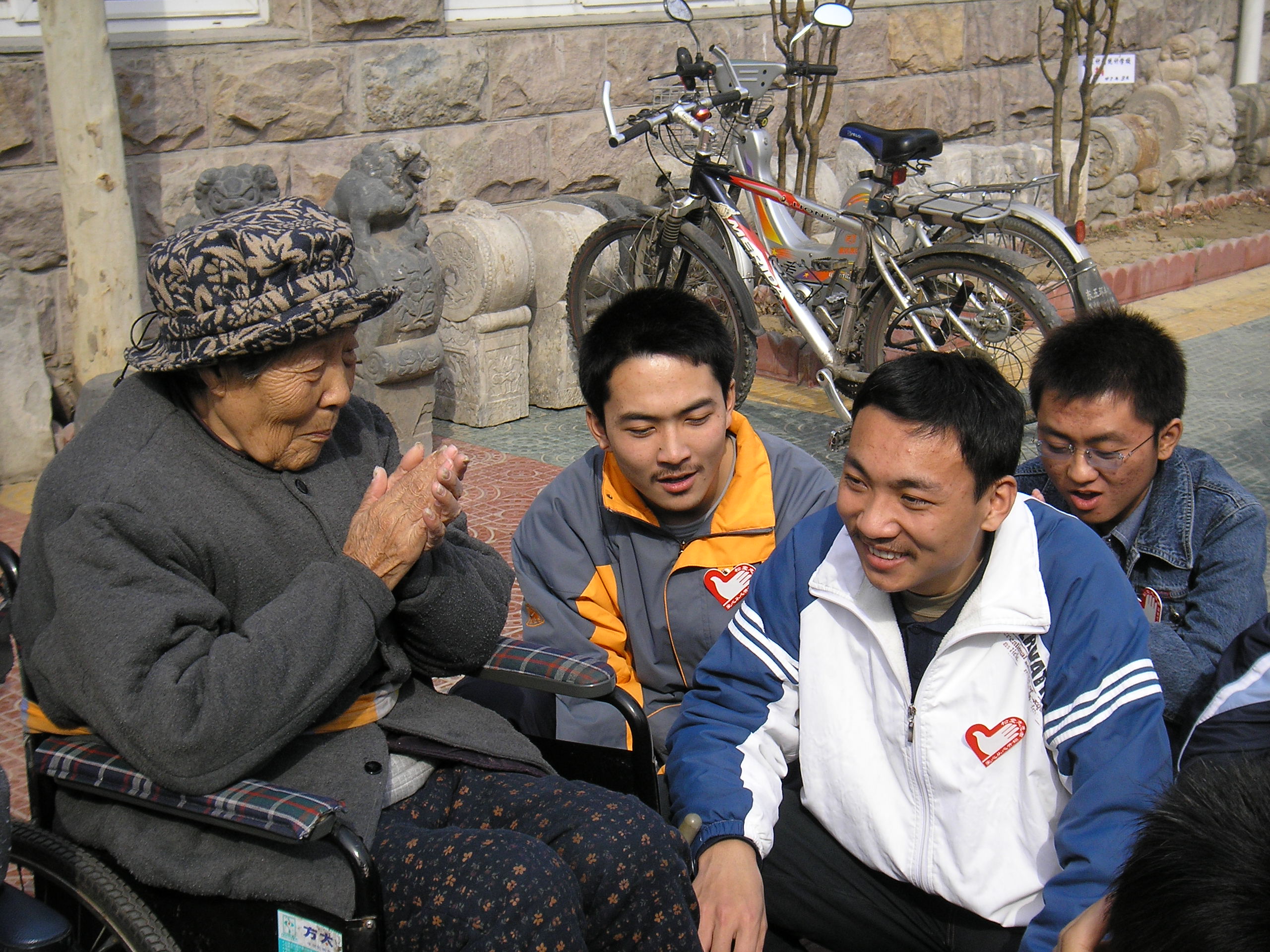 更多的志愿者则是集中在一楼的大厅里。十几位老人围坐成一圈,做着传球的游戏。志愿者就走到他们中间,和他们一起娱乐,并且还充满爱心的和老人们一起唱起了怀旧歌曲。老人们唱得非常投入,听得也十分开心。一位老人激动地谈起了自己参加抗美援朝的事迹。他告诉我们在那个艰苦的年代,生活是多么的不易。虽然现在失去了家人,但是有志愿者的微笑陪伴着他们,他感到一丝欣慰。还有一位老人曾是位诗人,诗作达几十万字。他还兴奋得给志愿者们念起了自己的诗作,志愿者们听得非常投入。在与老人的交谈中,同学们也领悟到了生命的真谛,青春易逝,时间宝贵。