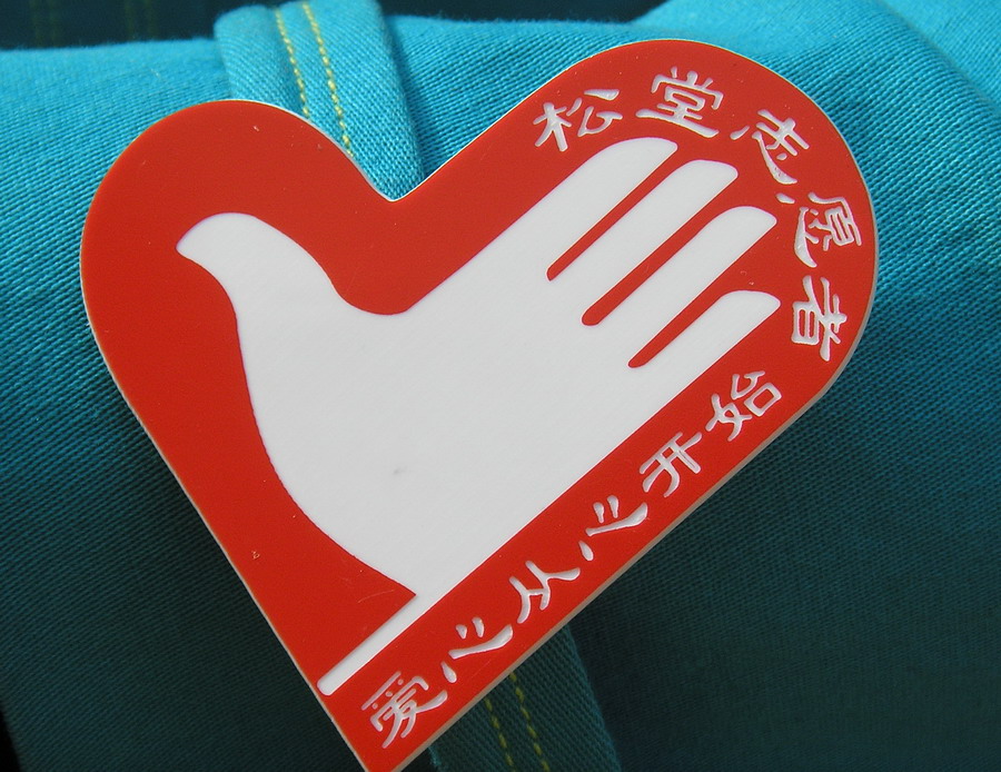 醒目的志愿者徽章--“爱心从心开始”