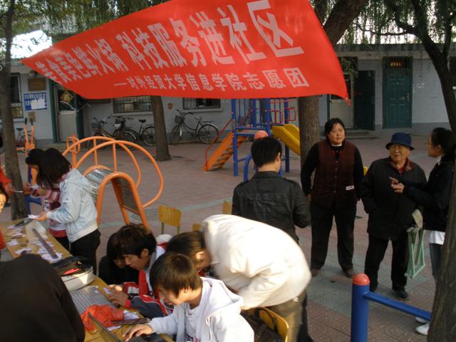 | 信息服务进社区,贴心贴士好帮手 ——信息学院青年志愿团举行“信息科技进社区”活动 11月7日下午,信息学院青年志愿者服务团与计算机网络协会联合举办了“信息科技走进社区”的志愿服务活动。这次活动旨在为普通居民提供科技基础知识的教育,使现代科技深入基层群众,加快科技现代化进程,同时提高学院学生专业知识的实践应用能力。 冬天已至,但志愿者们的热情丝毫不减,他们顶着寒风来到芍药居小区,为居民们义务讲解计算机、上网的一些知识及家电使用常识。同学们的服务立刻受到小区居委会的热烈欢迎,并为同学们提供了桌子、椅子等必要工具设备,同时也为志愿者提供了室内讲解场所。