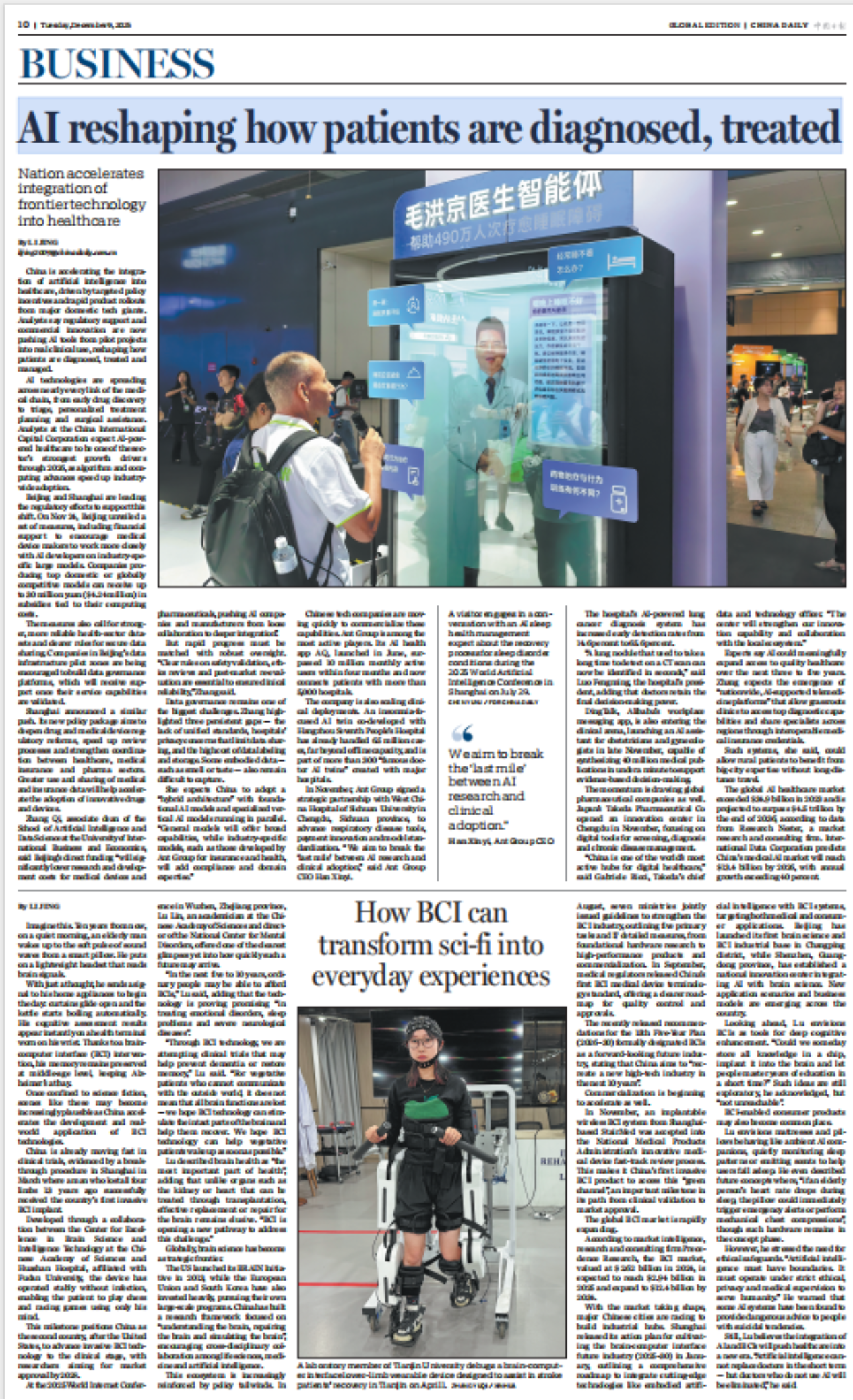 In November, Ant Group signed a strategic partnership with West China Hospital of Sichuan University in Chengdu, Sichuan province, to advance respiratory disease tools, payment innovation and model standardization. "We aim to break the 'last mile' between AI research and clinical adoption," said Ant Group CEO Han Xinyi.