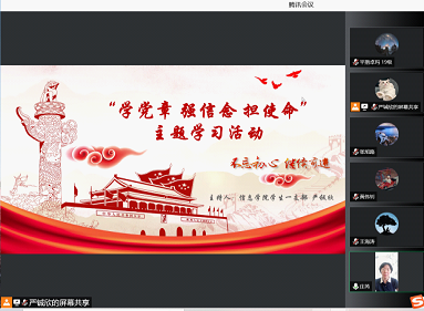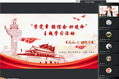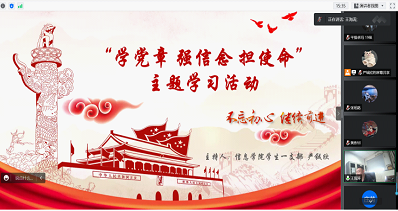 2022年7月7日下午,为了把全体党员的党章意识激发出来,把党的观念、纪律和规矩意识树立起来,把党的优良传统和作风传承发扬下去,信息学院学生一支部举办了“学党章 强信念 担使命”主题学习活动。为了提高学习效果,特邀请信息化处处长王海涛老师和教务处处长庄芮老师参加本次活动,指导全体学生党章的学习方法和学习要点。参会成员包括信息学院党委副书记张旭路老师、学生一支部书记黄伟钊老师,以及信息学院学生第一党支部党员、预备党员和入党积极分子。此次主题活动通过腾讯会议以线上方式进行。