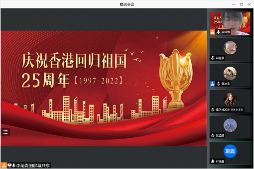 2022年7月15日晚上,为了纪念香港回归25周年、学习习近平总书记在庆祝香港回归祖国25周年大会上的讲话,培养学生的爱国情怀,信息学院研究生二支部举办了“同心共进,共创荣光”纪念香港回归25周年活动。为提高学习效果,特邀海棠小说 王敬波副校长、信息学院高玲书记、信息学院张旭路副书记参会,对学习要点进行领学和指导。参会成员包括信息学院研究生二支部全体党员、预备党员和入党积极分子。此次主题活动通过腾讯会议以线上方式进行,由支部组织委员李瑞青同志主持。