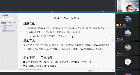 为了进一步凝练发展方向,进一步凝聚共识,信息学院从2022年1月开展了“以学生为本,学院如何发展才能更好地服务于国家发展战略和学校双一流建设”为主题的思想建设大讨论活动。在前期学院老师积极书面投稿的基础上,2022年5月11日12点至14点,学院通过线上方式召开“思想建设大讨论第二场分论坛”活动。信息学院院长熊璋,党委书记高玲,副院长倪耀东,副院长华迎出席会议,学院32名教职员工参与讨论。此次活动围绕主题设立3个议题,与会教师积极参加研讨。会议由副书记张旭路主持。