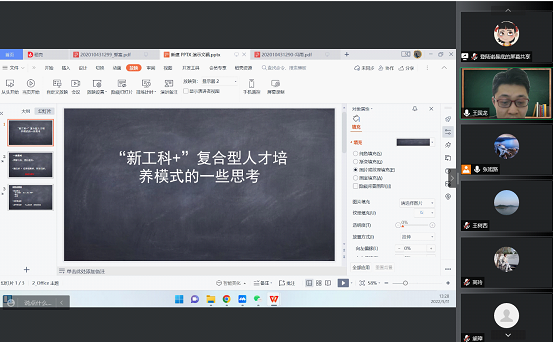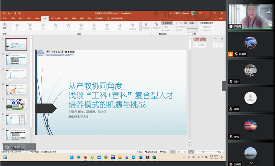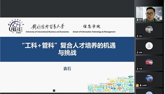 围绕第二议题:“新工科+”复合型人才培养模式的机遇与挑战,屈启兴老师谈了自己对新工科的理解,同时指出新工科人才培养需要走学科交叉路线,提出复合型人才的标准是知识复合、能力复合、思维复合的三个复合,最后又提到了自己对复合型人才的认识,即技术理论人才、技术应用人才和跨学科复合型人才。袁石老师认为当前从复合型人才培养是社会的需求,符合学校的定位和满足学生成长的需求,但是也面对这计算机课程如何能够更加吸引同学,如何引领同学们进入到企业进行研发工位实习,如何将管理课程和计算机课程进一步融合等问题,为此建议在管科的课程之中增加计算机体验,在计算机课程之中增加管科场景应用,同时建议在合作企业之中带领学生从事科研性质的实习工作。于晓丹老师从产教协同的角度分析了复合型人才培养,认为数字经济人才的特征是通用型、交叉型、复合型。在人才培养中要注意产教协同,要注意简单目标和复杂目标平衡,短期目标和长期目标平衡,定量与定性的平衡。刘宁宁老师认为新工科人才培养,应该更加注重实践出真知,通过建立企业实验室的方式,为新工科人才培养提供更多的实习实践机会,以此促使学生真正进入解决工程问题的工作状态。王国龙老师认为复合型人才培养更应该注重思维融合,能够让学生真正做到利用信息技术最新成果解决现实中遇到的问题,在课堂教学中,应该主要将讲授的内容尽可能与企业开发的各个层次相对应,以此做到与现实工作场景相呼应。张宇轩老师结合自己求学的经历,认为复合型人才是当前市场中所急需的,建议学校在发展“新工科+”的工作时,要注意工科哪些元素与其他学科更容易融合,更容易培养出合格的复合型人才,从而探索不同学科的“新工科+”的机制。