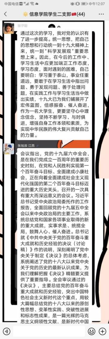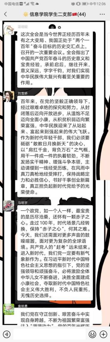 信息学院本科生二支部在11月18日晚以线上分享交流的形式,对十九届六中全会精神进行了学习。活动由支部副书记陈家盈同志主持,二支部所有成员参与。二支部成员观看了十九届六中全会的发布会,感悟会议精神,充分交流各自的感想与心得,大家纷纷表示作为年轻党员在深切感受党史中“苦难和辉煌”“曲折和胜利”“付出和收获”的心路历程后,要始终保持谦虚谨慎、戒骄戒躁、锐意进取的心态,踏踏实实做第二个百年奋斗目标的“接棒者”,在新时代奋进的新征程中永葆革命精神和斗争精神,越是艰难越向前,不断开拓进取。会议取得了圆满的效果。