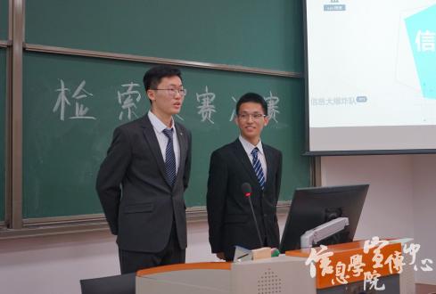 主持人张皓晋在简单讲述决赛赛制后,宣布信息检索大赛决赛开始。第一组的许沈崇智和尹鹏斌首先带来了他们的成果展示。他们以长三角和雄安新区为例,探讨了区域经济发展的模式和成果,同时展现了他们研究过程中所采取的检索方式,如各类搜索引擎、知网、爬虫等。第二组的选手郑力郡和陈润楠从检索的途径、技巧、思路、主题应用等方面全方位地阐释了信息检索这一内容,其中讲解的win10快捷键使用技巧等内容很具实用性。