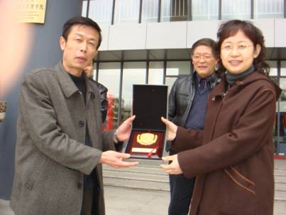 黄健青副院长向上海大学国商与管理学院执行院长沈瑶赠送学校礼品