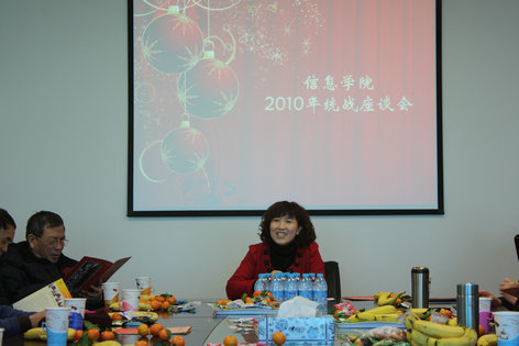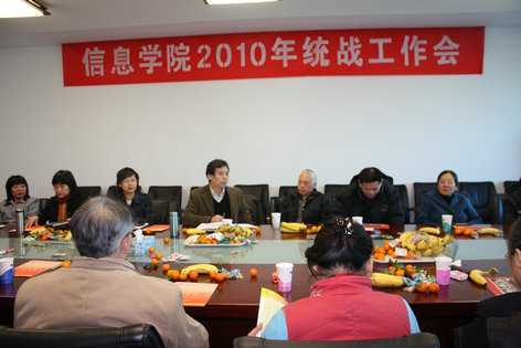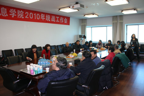 2010年12月31日,信息学院分党委召开离退休及统战教师座谈会。学院离退休教师、民主党派20多人参加会议,院长陈进、分党委书记巩喜云、副院长曹淑艳、党总支副书记张志娟、副院长黄健青、院长助理赵星秋以及总支委员到会与大家亲切交流。