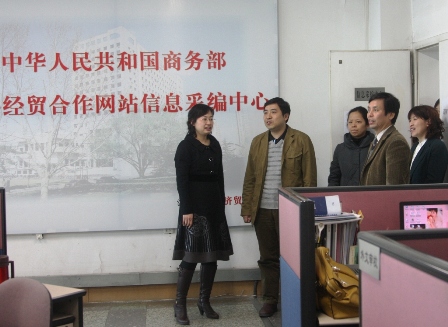 自2010年12月28日教育部、商务部共建对外经贸大学签字仪式以来,我校“两部共建、部校合作”的工作不断向前推进。2011年3月24日下午,商务部信息化司蔡裕东副司长、公共服务处王芳副处长莅临我校“中外经贸合作网站信息采编中心”调研,听取工作汇报,探讨今后进一步做好服务与支持的工作内容。