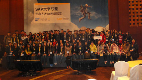 发言,介绍了我校参加大学联盟和使用SAP学习资源的情况。同学们参加了SAP大学联盟大会,会议以开启人才培养新篇章为主题,来自SAP、惠普、三星、德勤等企业的代表做了其企业的大学联盟或招聘计划的展示,为同学们提供了丰富的企业信息。会议由SAP大学联盟负责人杨焜女士主持,SAP联席首席执行官孟鼎铭先生也出席发言并回答了同学们的问题, SAP对大学联盟计划的重视和对大学生的希望展现的淋漓尽致。大会上,参加过SAP技术应用竞赛及SAP大学培训项目的优秀学子也做了成果和经验分享;信息学院07级本科生魏萌同学受邀做了学习SAP相关课程的体会的报告,魏萌现就职于埃森哲公司做管理咨询顾问,她在大三时学习到《供应链和ERP应用》课程,并在中国SAP实习了8个多月时间,获得了丰富的经验。魏萌从知识的学习、技能的提高和视野的扩展等方面讲了自己的体会和收获,并寄语学弟学妹们尽量扩展视野,利用好大学联盟课程,为自己增加筹码。同学们在下午的联盟大会上收获的不仅是对各大企业的了解,还有来自每位发言人的寄语。会议结束后,全体参会人员在大会现场合影留念。