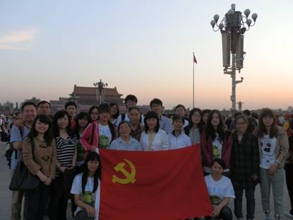 信息学院学生一支部于5月27日的清晨组织11级和09级的部分党员代表来到了天安门广场,观看升国旗仪式。一同前往的还有分党委副书记张志娟老师、学生一支部书记秦东方老师,以及退休二支部的部分老干部。