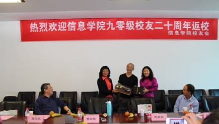 本次活动由校友代表刘文杰主持。曹淑艳副院长首先代表学院全体师生对十几位90级优秀校友返校表示欢迎。曹院长表示,学院的工作离不开校友们的支持与帮助,校友是学院发展的主要动力之一。她还向校友们介绍了学院近年来在科研、教学、国际课程班等方面取得的主要进步,希望能够和校友们保持密切联系,促进学院科研项目和学生实习就业工作的开展。90级校友代表向学院赠送礼物,感谢信息学院对大家的培养,并表示会常回学校看看,增进校友与学校、学院的联系与合作。
