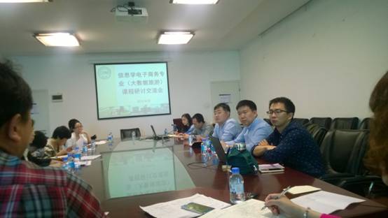 华迎副院长首先介绍了信息学院对于大数据旅游方向专业课程的教学安排和基本教学规划。接下来6门专业课程“旅游管理概论”“旅游目的地管理”、“信息技术旅游创新”、“旅游大数据分析”、“旅游地理信息与空间计算基础”“IT战略与企业竞争优势”任课教师分别对课程设计、教授内容、建设构想等提出了自己的看法,如在授课内容中引入案例,带领学生研讨分析,以提高学生思维能力及研讨能力,培养应用型人才;在侧重于信息技术类课程的内容设定上,以旅游做背景,采用虚拟机方式进行大数据分析。因为北京联合大学旅游学院在旅游行业教学方面经验丰富,因此教师们提出对课程内容深度的把握程度、以及在教材的选用上希望得到旅游学院教师的推荐。双方教师进行了讨论交流,旅游学院教师有针对性的提出建议,对一些需要学生学习先修知识的课程,希望授课教师能在课前给予一定的引导;对于实践操作性强的课程,可利用联大的实验室资源进行演示实践;同时希望能够利用该校教学案例实践的优势,与信息学院的教师们共同建设课程教学团队,共同进行教学研究。与会双方均表示在课程目标及课程内容定位上可以进一步探讨,结合双方的优势,共同开发课程内容。