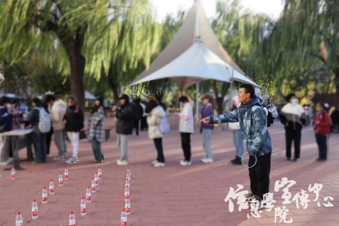 套圈游戏与趣味猜词也备受同学们欢迎。同学们兴奋地看着手中的圆环,奋力一掷,现场充满了欢声笑语。另一边的趣味猜词游戏同样热闹非凡。有的同学低头沉思、有的同学热烈讨论,他们全神贯注地投入到游戏之中,享受着游戏带来的乐趣。