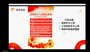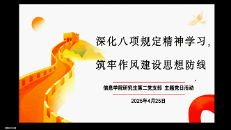 (信息学院研究生二支部党员王竟宇讯)为深入学习中央八项规定精神,强化支部党员的纪律意识,贯彻全面从严治党的重要原则,2025年4月25日信息学院研究生二支部于线上举行“深化八项规定精神学习,筑牢作风建设思想防线”党日活动。此次活动旨在强化支部学生党员的政治自觉、思想自觉、行动自觉,引导全体同志深刻认识全面从严治党永远在路上的战略定力,树牢纪律规矩意识,校准价值坐标,在科研学习、社会实践、日常言行及未来工作中自觉遵守党的纪律要求,切实将中央八项规定精神内化于心、外化于行。