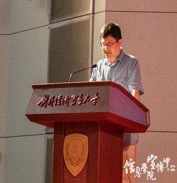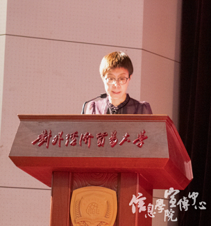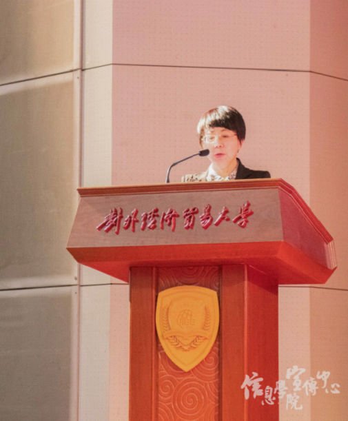 王敬波副校长对全体新生致辞。王校长首先代表学校祝贺信院2022级新生在贸大相遇,紧接着她从当下风云变幻的时代背景出发,指出同学们作为身处变局之中的希望一代,应当肩负起家国使命,放眼祖国建设,树立远大理想。王校长还指出,信息学院时刻走在新工科发展的前列,信院师生生逢其时,但也重任在肩,还亟需不断总结提升,争取再创佳绩。最后王校长着眼国家的科技发展,感慨老一辈功勋元老们的付出,也由此向新一代提出了三点期望,希望同学们都能成为有情怀、有信仰、有信心、有定力、求真务实、韧劲不拔的人,以惠园为起点,真正成长为国家栋梁之材!