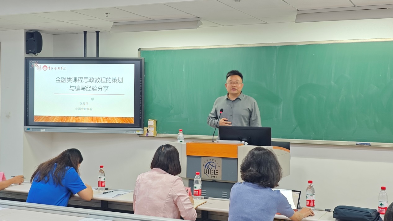 随后,中国金融学院副院长张海洋教授以“金融类课程思政教程的策划与编写经验分享”为主题进行主讲。张教授介绍了《教程》项目的起源和成果,分享了金融类课程如何将课程知识点与课程思政相结合,强调了教学设计在课程思政中的重要作用。通过具体案例,张教授展示了如何在课堂中融入思政元素,并分享了自己的心得体会和经验。