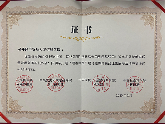 2025年5月25日,“理响中国”党的创新理论网络传播精品分享会在北京举办。“理响中国”理论融媒体精品征集展播活动自2024年7月启动以来,共收到来自600多家单位报送的近3000件作品,经过初选、终选以及结果公示,活动产生优秀理论作品30件,其中文字类15件。陈润宇老师的作品《【理响中国·网络强国】从网络大国到网络强国:数字发展绘就高质量发展新画卷》成功入选文字类优秀作品,这不仅是对陈润宇老师个人学术水平和理论研究能力的高度认可,也是信息学院在理论研究领域的一项重要成果。