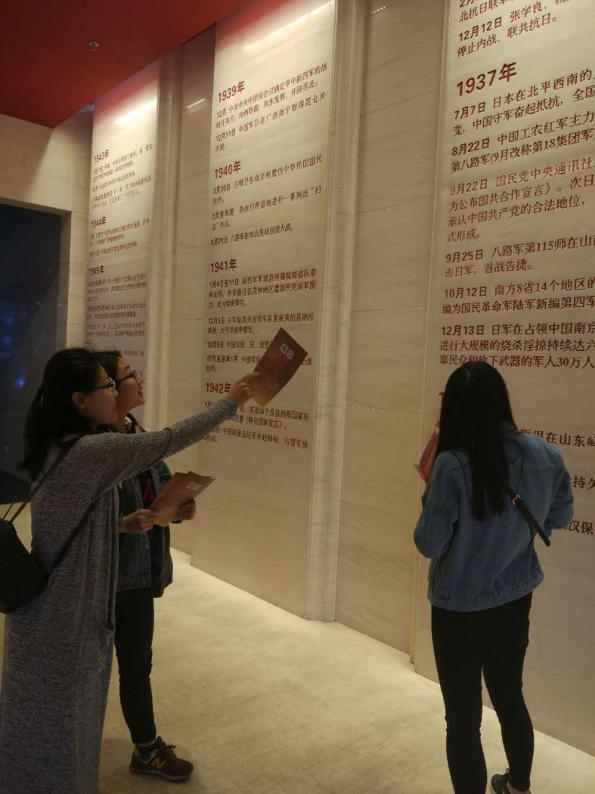 走进中国人民抗日战争纪念馆,展馆以历史图片和实物为主,辅以半景画、雕塑、油画等手段,呈现了中华民族从1931年到1945年的抗战历程。进入展厅看到“一二九运动的雕塑”、“平型关大捷模型”、“牺牲烈士的名单”、“日本签订投降协议场景”等,同学们重温了中华民族不朽的抗战历史,对许多不为人知的感人细节有了更多地了解,对全民族的艰苦抗战有了更深刻地认识。