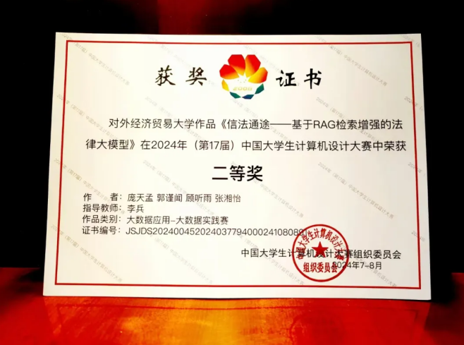 2024年7月18日至20日,第17届中国大学生计算机设计大赛决赛(“大数据应用-大数据实践赛”类别)在上海对外经贸大学(上海)举办。由我院李兵老师指导,庞天孟、郭谨闻、顾听雨、张湘怡四位优秀本科生组成的团队,凭借作品《信法通途-基于RAG检索增强的法律大模型》,在激烈竞争中脱颖而出,获得大赛二等奖。