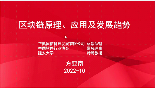 2022年11月6日,信息学院举办第二场数字经济大讲堂活动。讲座由延安大学特聘教授,正奥国信科技发展(天津)有限公司副总裁方亚南博士主讲,题为《区块链原理、应用及发展趋势》。讲座由电子商务系系主任屈启兴副教授主持,信息学院师生在线参与了此次活动。