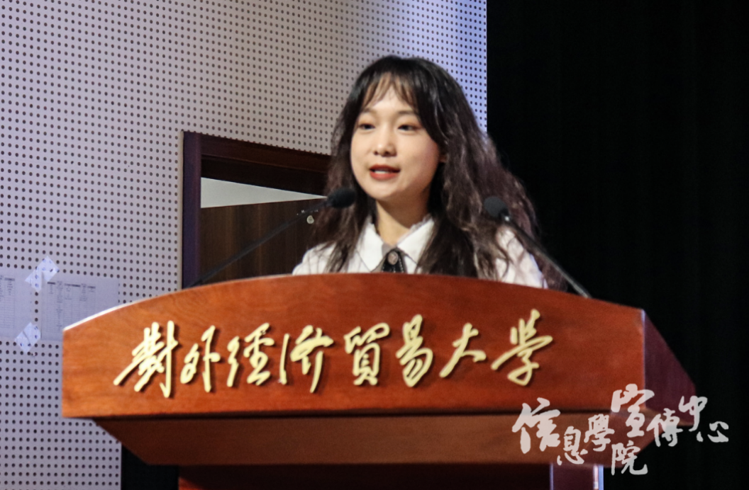 紧接着,新生班主任代表许萌老师发言。她首先祝贺新生们开启了人生的新篇章,进入信息学院这个充满温暖的大家庭。她提到学院能给同学们提供广阔机会,让同学们能追求梦想,提升自我,取得进步;并表达了班主任老师们对新生的关怀与支持。青春由磨砺而出彩,人生由奋斗而光华。最后,许老师祝愿所有新生同学们在大学中养成良好学习习惯,关心他人,坚持锻炼,保持健康,度过充实的大学生活。