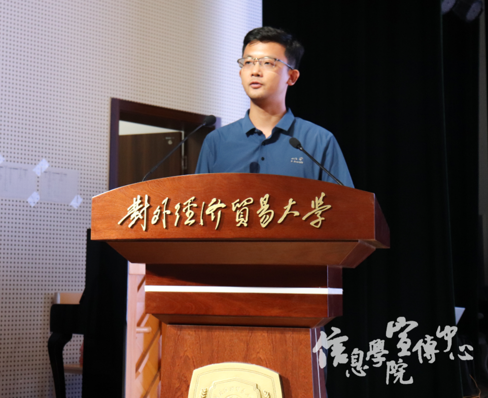 随后,教师代表杨向峰教授发言,他首先对新同学们表示热烈欢迎。杨老师指出:AI是当今时代的重要因素,人工智能发展迅速,不断推动创新,信息学院恰能提供这样一个良好的环境,同学们能学到先进的人工智能技术,有机会参与学术科研项目,使自己不断成长。杨老师希望同学们能珍惜机会,保持热情,成为引领时代潮流的弄潮儿,并祝同学们学习进步,生活愉快。