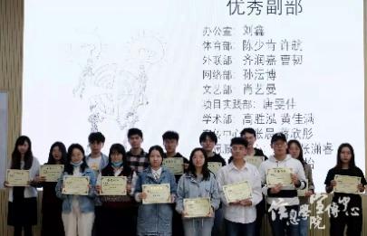 大会第三部分是对上半学年的优秀部门、部门负责人以及干事进行表彰。工作人员为各位优秀代表颁发奖状,随后大家在台上合影留念。同学们手中的奖状,寄托着团学联对同学们的信赖、期许、肯定和认可,也希望同学们可以再接再厉,在新的学期创造新的辉煌。