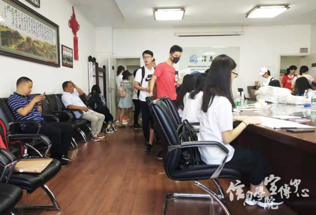 精心布置的报到现场,诚信楼前高高飘扬的院旗,阵阵威武响亮的鼓声,处处彰显着信院迎新的激情。信息学院院长冷柏军,分党委书记高玲,副院长倪耀东,分党委副书记张旭路,2019级新生辅导员、分团委书记黄伟钊老师也早早到达迎新现场,指导迎新工作。