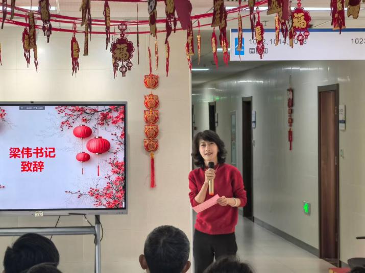 信息学院党委书记梁伟代表领导班子向全院教职工致以诚挚的新春祝福,对过去一年全体教职工的辛勤耕耘和无私奉献表示衷心感谢。梁书记表示,在学校党委坚强领导和全院师生共同努力下,信息学院在各方面取得了令人骄傲的成绩,信息学院逐渐站在了发展“AI+教育”的最前沿。未来,信息学院会继续保持建设推动“AI+学科交叉”的贸大工科道路,在学科建设、人才培养、科研创新、服务社会等方面实现新的突破。