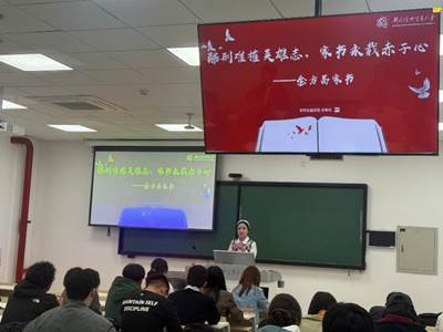宣讲围绕抗战英雄的家书与事迹展开,激励青年学子从中汲取精神力量,厚植爱党爱国情怀。宣讲过程中,国际经济贸易学院杨砚成同学以《高唱动人旋律,矢志保卫祖国——冼星海家书》为题,展现了人民音乐家以音符为枪、用旋律鼓舞斗志的赤子之心;国际经济贸易学院汪韫珂同学带来的《铭记先烈志,勇担家国情——李育才家书》,深情讲述了革命先辈为国为民、舍生忘死的家国担当;保险学院李唯佳同学则通过《酷刑难摧英雄志,家书永载赤子心——金方昌家书》,生动再现了革命烈士坚贞不屈、视死如归的英雄气概。宣讲人声情并茂的诵读与深入浅出的讲解,使在场同学深受触动。