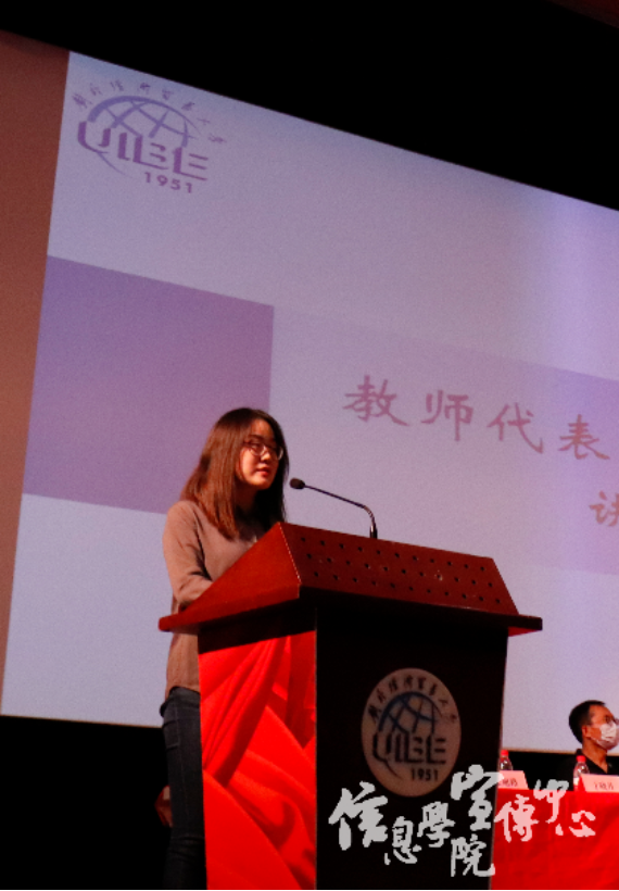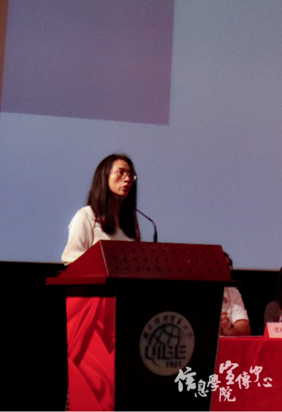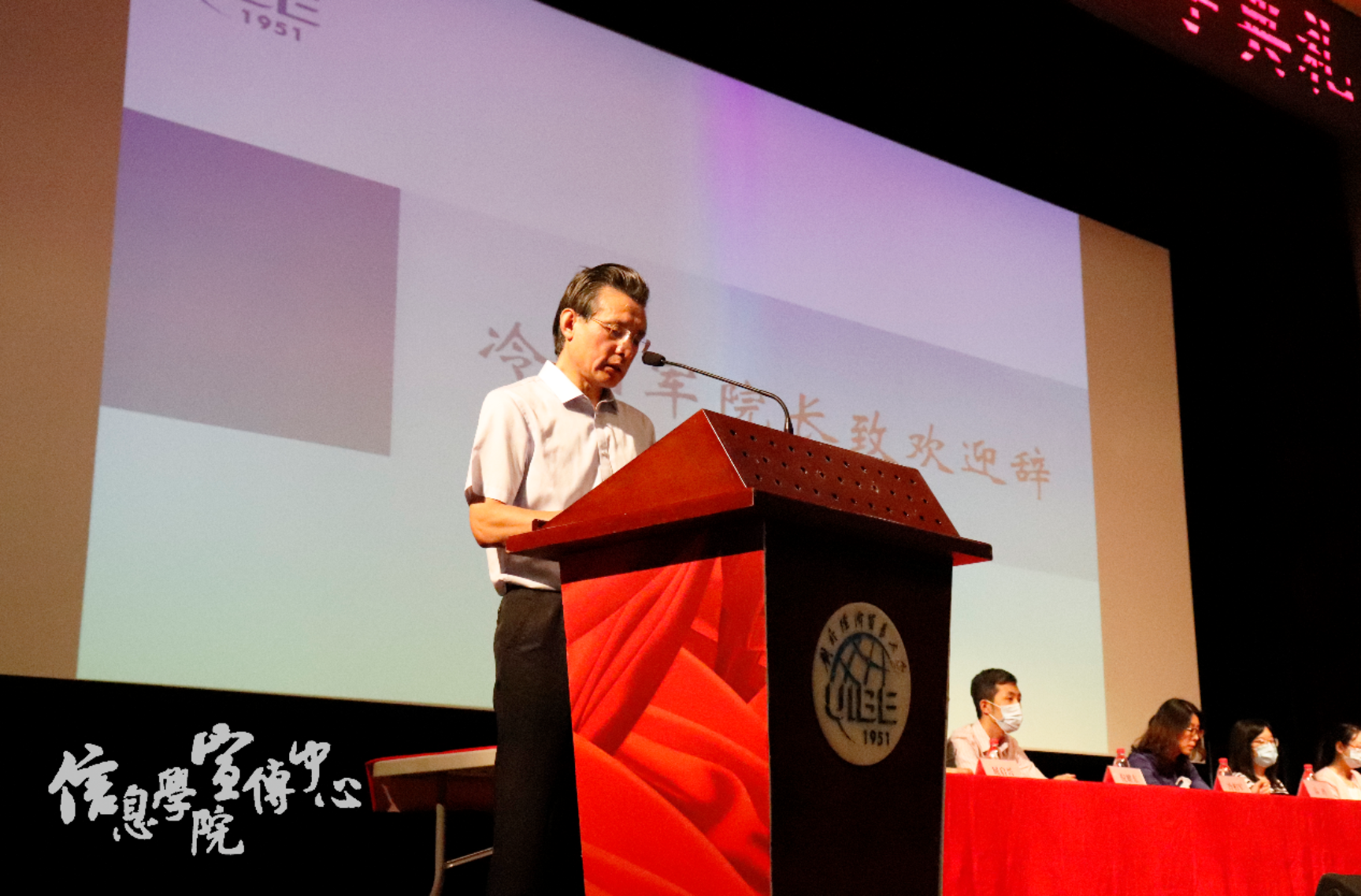 随后高玲书记,华迎副院长,倪耀东副院长分别上台讲话。高玲书记对新生们的思想政治素养方面提出了要求,她提到同学们无论是学习还是日常生活中,都要做到“从大处着眼,从小处入手”。既要培养大局观,也要学会妥善解决每一件小事。华迎副院长则从课程学习方面提出了建议。她强调了树立专业自信,信息学院是拥有极佳前景的,是走在时代前沿的。华迎副院长结合自己多年来的教学经验,向同学们介绍了大学学习与高中的区别,帮助同学们尽快适应大学节奏。倪耀东副院长从学术科研方面发表了讲话。他认为,科研不是枯燥乏味的。与学习前人留下的知识不同,科研是发掘人类世界的新知识,触碰人类的认知边界。同时倪耀东副院长还特别强调了学术诚信的要求,诚信是开展科研活动必须具备的素质和素养。