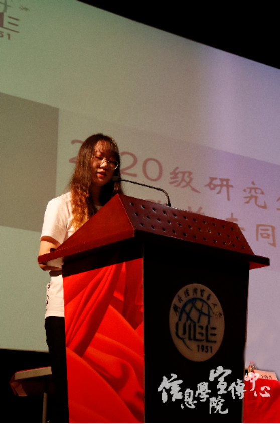 紧接着,教师代表于晓丹老师,新生班主任代表马双老师,在校生代表肖迪同学,2020级本科新生代表夏傲然同学,2020级研究生新生代表张艺卉同学依次上台发言。两位老师紧扣学习生活给同学们提出了建议,大一有很多新事物可以尝试,但学习应当是重中之重。三位同学的发言都表现出积极向上的学习生活态度和对未来的憧憬与期待,相信台下的很多同学也感同身受。随着最后一位同学的演讲结束,本次大会的议程已全部结束。离场后各个班级依次与学院领导老师在求索楼前合影留念。至此,新生典礼圆满落下帷幕。
