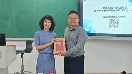 在点评交流环节中,政府管理学院刘洁书记和信息学院梁伟书记分别进行了总结点评。刘书记高度评价了金悦老师和李海莲老师的课程设计,指出其新颖性和思政融入的深度。梁书记则强调了工科课程中融入思政的挑战,并呼吁全体教师共同研究、推进课程思政的进一步发展。活动最后,教师中心邀请张海洋教授作为系列教程项目负责人代表,向政府管理学院与信息学院各赠送了一套“海棠小说 课程思政系列教程”,会议在热烈的掌声中圆满结束。