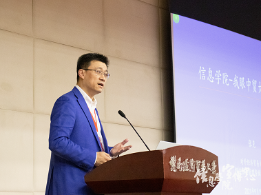 紧接着由信息学院院长冷柏军教授向校友介绍学院发展状况,冷院长代表学院全体教职工向全国各地的信息学院校友表示欢迎。紧接着,他结合自己在学校30余年的工作经历,回顾了学院发展历程。他指出信息化时代的到来,信息学院学子在数字产业化和产业数字化的发展道路上大有可为,希望各位校友关注学院发展,为学院发展献计献策。
