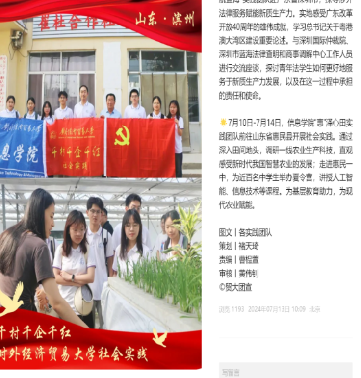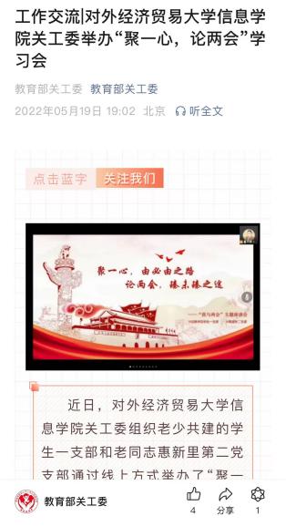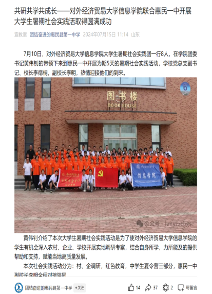 此次红色“1+1”共建活动的成功开展,得到了共建支部的支持和认可,惠民一中公众号和学校公众号都对“惠”泽心田红色“1+1”共建活动进行了报道。此外,支部共建活动的亮点和成果更是获得了北京市和教育部关工委公众号的多次报道。这些荣誉不仅是对信息学院学生一支部工作的肯定,更是对新时代青年责任与担当的赞誉。
