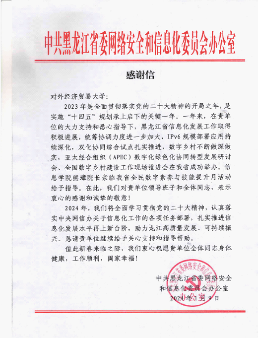 信息学院坚决贯彻落实习近平总书记重要指示批示精神和党中央决策部署,坚持把服务国家作为高校科技工作的最高追求,充分发挥学院科技创新优势,组织广大师生坚持“四个面向”,服务“国之大者”,科技创新服务经济社会高质量发展初显成效。熊璋院长亲临指导黑龙江省全民数字素养与技能提升月活动。**龙江省委网络安全和信息化委员会办公室对我院领导班子和全体同志表示衷心的感谢和诚挚的敬意,特发来感谢信以示感谢。