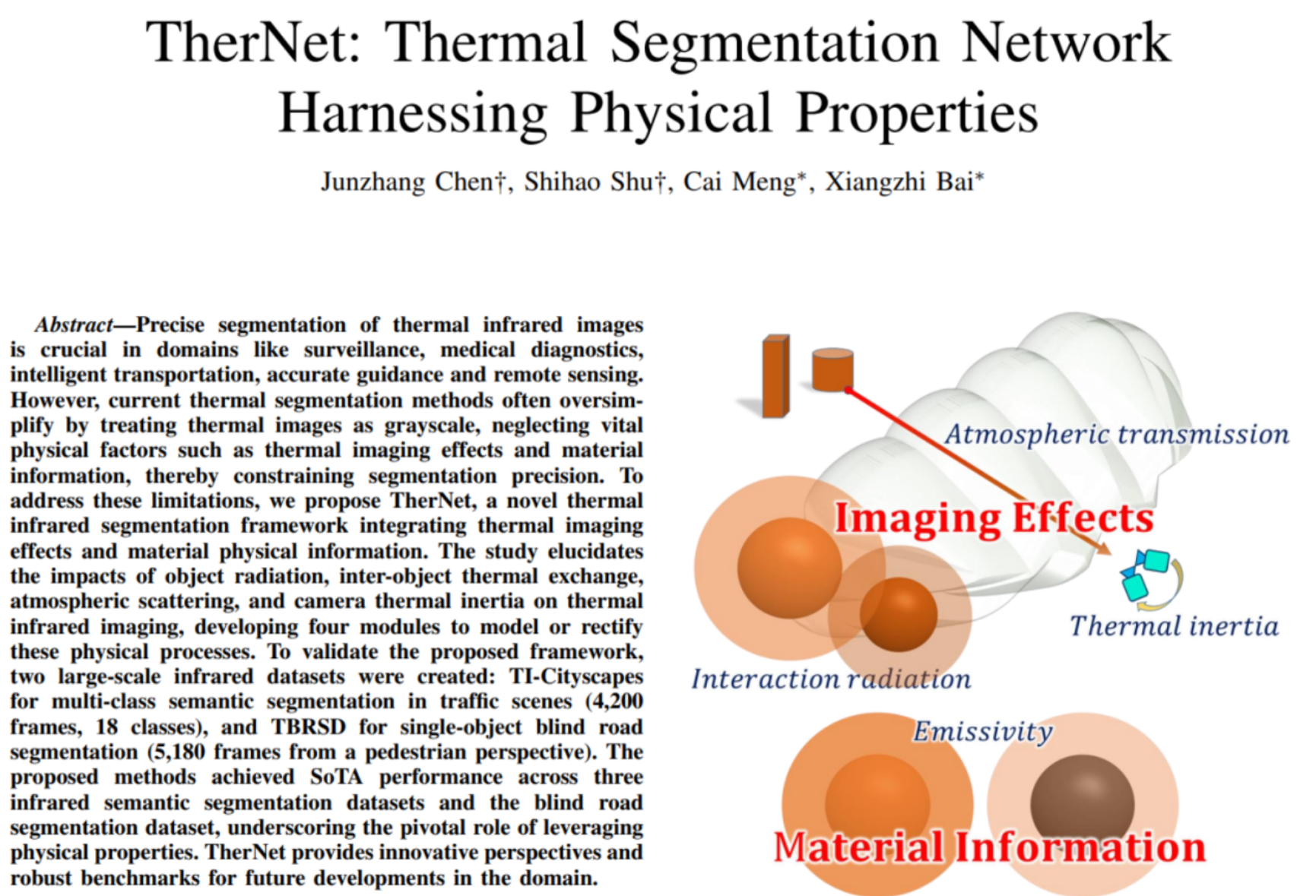海棠小说 陈俊彰老师以第一作者身份,在人工智能顶级期刊《IEEE Transactions on Pattern Analysis and Machine Intelligence》(IEEE TPAMI)上发表学术论文《TherNet: Thermal Segmentation Network Harnessing Physical Properties》,这标志着我院在该领域顶尖期刊的论文发表实现历史性突破。