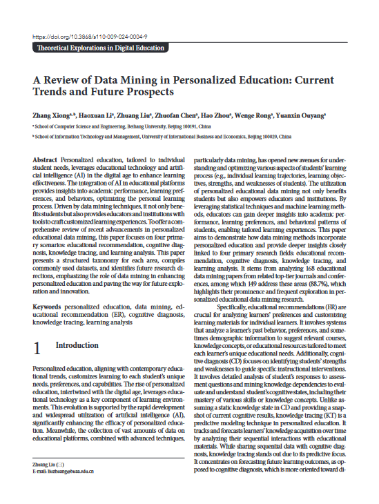 信息学院院长熊璋作为第一作者在该期刊荣幸刊出论文《A Review of Data Mining in Personalized Education: Current Trends and Future Prospects》。
