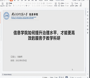 首先,王敬波副校长讲话。她高度肯定了信息学院往期思想建设大讨论的成果和本次大讨论的选题。王校长提出“无团队,无大发展”的理念,信息学院是学校有较大发展潜力的学院,今后要加强学院的团队建设,希望未来招聘时,将团队合作能力作为招聘条件之一,要把教师个人发展作为团队发展的引擎,要做1+1大于2的工作;王校长希望各位老师在信息技术飞速发展的大背景下,能够顺应时代发展,要加强跨学科的理解能力,并将此作为自身发展的原动力。王校长希望信息学院能够加强治理能力,提升治理水平,并将之作为学院建设的重点之一,要通过公开公平讨论形成的制度进行治理,在治理过程中要强调集众人的智慧进行共治,要发扬各位老师的主人翁意识,形成协商、团结、向上的学院氛围;王校长也充分肯定了各位老师对于在线教学所付出的努力,希望信息学院借助自己的专业优势成为学校在线教育的范例,逐步积累在线教育质量提升的经验。