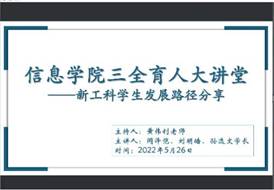 2022年5月26日晚19点整,由信息学院主办的三全育人大讲堂于腾讯会议线上举办。本次讲堂旨在响应国家战略号召,通过分析与展望新工科专业的学生发展路径,激发同学们的专业自信和学科认同,帮助同学们明确未来发展的方向并进一步坚定大学目标,从而达到学院全员、全过程、全方位的“三全”育人目标。本次讲座邀请到闻泽恺、刘明皓、孙逸文三位同学主讲,学院党委高玲书记和张旭路副书记出席讲话,活动由学院分团委书记黄伟钊老师主持。