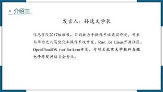 第三位主讲人是2021届优秀校友孙逸文学长,孙逸文学长是2017级班长,2021年考研至北京大学软件与微电子学院网络安全专业,曾参与华为无人驾驶汽车操作系统开发,Rust for Linux开源社区开发等。他的发言主要结合了自身的研究方向,为大家普及了操作系统开发这一前沿领域的学习要点。孙学长首先从他参与过的两个重要项目入手,向大家介绍了操作系统开发的工作内容并对其就业前景进行了分析,同时为大家罗列了几点关于学习操作系统原理的建议。针对这几点,孙学长还很细心地为大家推荐了学习用书及课程,同学们均受益匪浅。