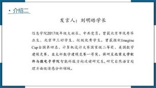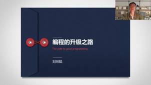 接下来进行分享的是2021届优秀校友刘明皓学长,刘明皓学长是2017级年级大班长,曾获北京优秀毕业生、北京市三好学生,于2021年保研至北京大学软件与微电子学院智能科技方向攻读研究生,研究自然语言处理及情感分析领域。刘学长的主题“编程的升级之路”详细介绍了他是如何从编程小白升级到入门,再由入门进阶到熟练,最后成为大神的经历。紧接着刘学长主要就如何提升编程水平给出了建议:在学好专业知识的基础上,多动手,将知识付诸实践,少熬夜、多锻炼,保持大脑和身体随时在线。之后刘学长分享的互联网择业tips、三个阶段论以及书籍课程的推荐等都是干货满满,给出的建议也都切实可行,同学们在讲座后多加消化与应用,假以时日,一定能在编程水平上有质的飞跃。